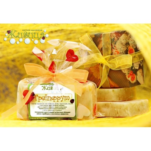 Состав: омыленные масла пальмы, оливы, подсолнуха, кокоса и клещевины, вода, масло сладкого миндаля, цедра цитрусовых, парфюмерная композиция "Грейпфрут".